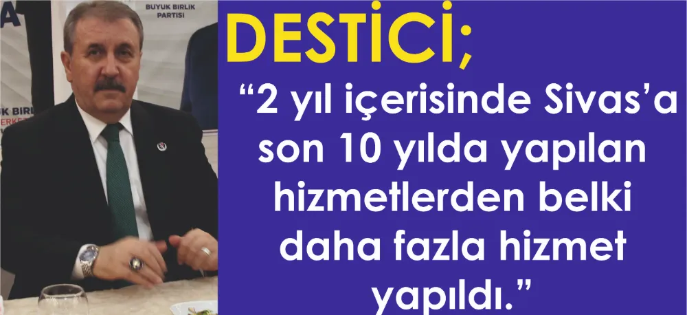 Sık sık SİVAS'ı ziyaret eden BBP Genel Başkanı Mustafa DESTİCİ, son kamuoyu araştırmalarına göre partinin SİVAS'ta oyunun arttığını ve 2 yıl içerisinde Sivas’a son 10 yılda yapılan hizmetlerden belki daha fazla hizmet yapıldığını söyledi.