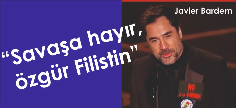 Bardem, törende giydiği smokinin yakasında “Savaşa hayır” yazılı bir rozet taktı ve Filistin’i desteklediğini gösterdi.
