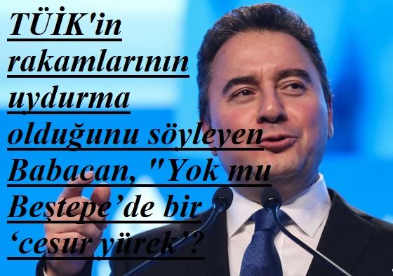 DEVA Partisi Genel Başkanı Ali Babacan, TÜİK'in açıkladığı enflasyon rakamlarıyla vatandaşın enflasyonu arasındaki farka dikkat çekerek sosyal medya hesabından bir video paylaştı. TÜİK'in rakamlarının uydurma olduğunu söyleyen Babacan, "Yok mu Beştepe’de bir ‘cesur yürek’? Herkesin her şeyi bildiğini, gerçekleri çarpıtmanın bir işe yaramadığını, TÜİK’in rakamları uydurduğunu haykıracak kimse yok mu orada? " tepkisi gösterdi.
