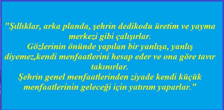 "Şıllıklar, arka planda, şehrin dedikodu üretim ve yayma merkezi gibi çalışırlar.Gözlerinin önünde yapılan bir yanlışa, yanlış diyemez,kendi menfaatlerini hesap eder ve ona göre tavır takınırlar. Şehrin genel menfaatlerinden ziyade kendi küçük menfaatlerinin geleceği için yatırım yaparlar."